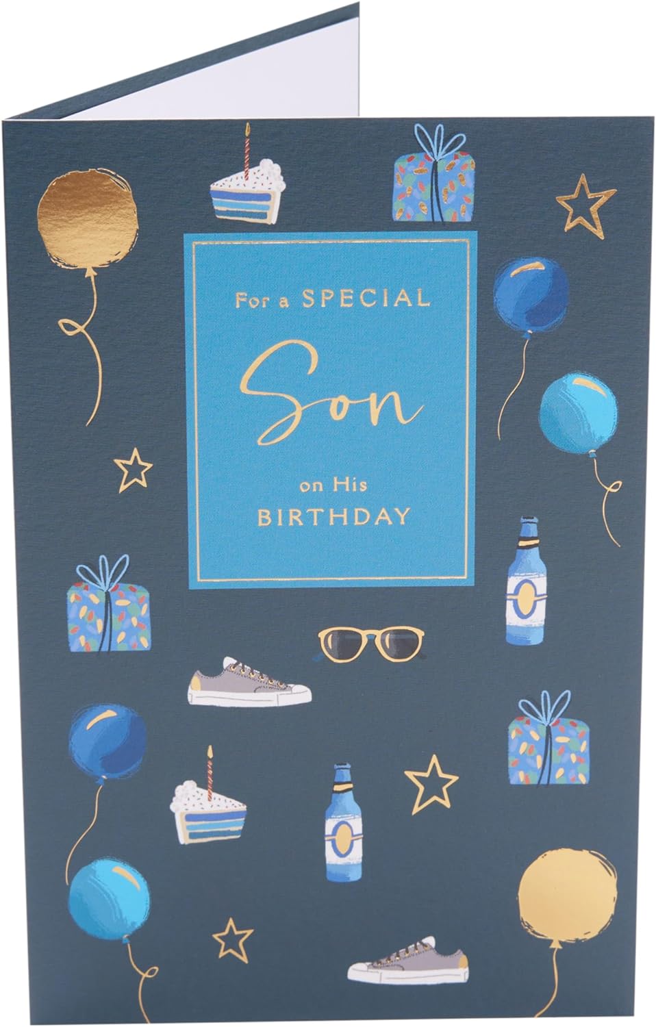 Tell him how much he means with this Son birthday card, featuring male icons, printed on premium quality board, and finished with gold foil. Message Inside Reads: Now that your birthday's here, this comes with love to say - That there could be no other son who means as much today. Happy Birthday. Card Size: 149mm x 229mm. Envelope Included. This product is FSC-labelled, meaning you’re supporting responsible forestry and helping fight climate change, protect biodiversity, and support communities.