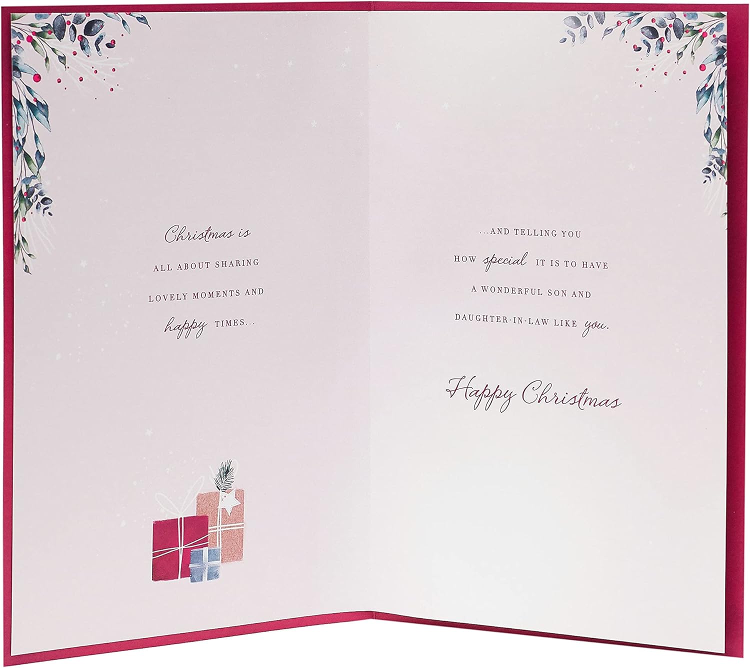 Send Christmas wishes to a wonderful son and daughter-in-law with this card, featuring a front door scene finished with gold foil and red gems. Message Inside Reads: ...and telling you how special it is to have a wonderful son and daughter-in-law like you. Happy Christmas. Card Size: 149 x 229mm. Envelope Included.