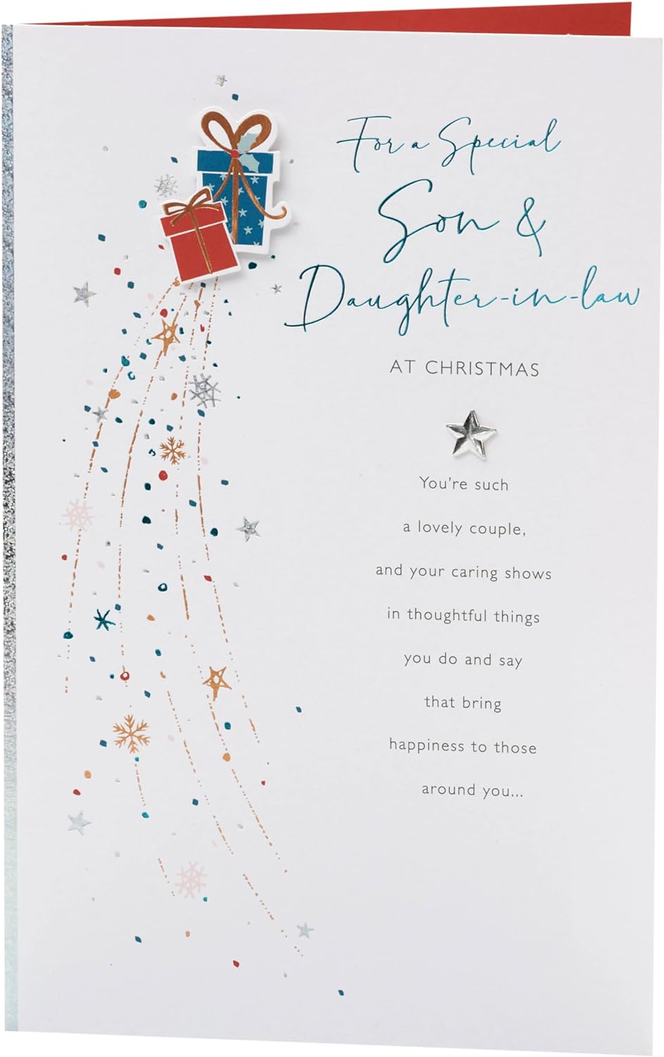 Tell your son and daughter-in-law how much they’re loved and appreciated with this heartfelt Christmas card, printed on premium quality board with metallic foil and 3D details. Message Inside Reads: Hope you know how much you're appreciated and loved at Christmas and always. Wishing You Both a Very Merry Christmas. Card Size: 165mm x 254mm. Envelope Included.