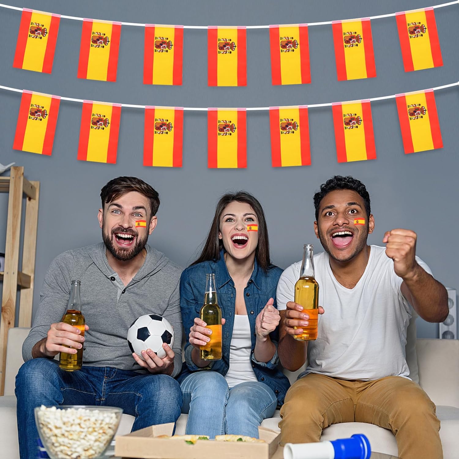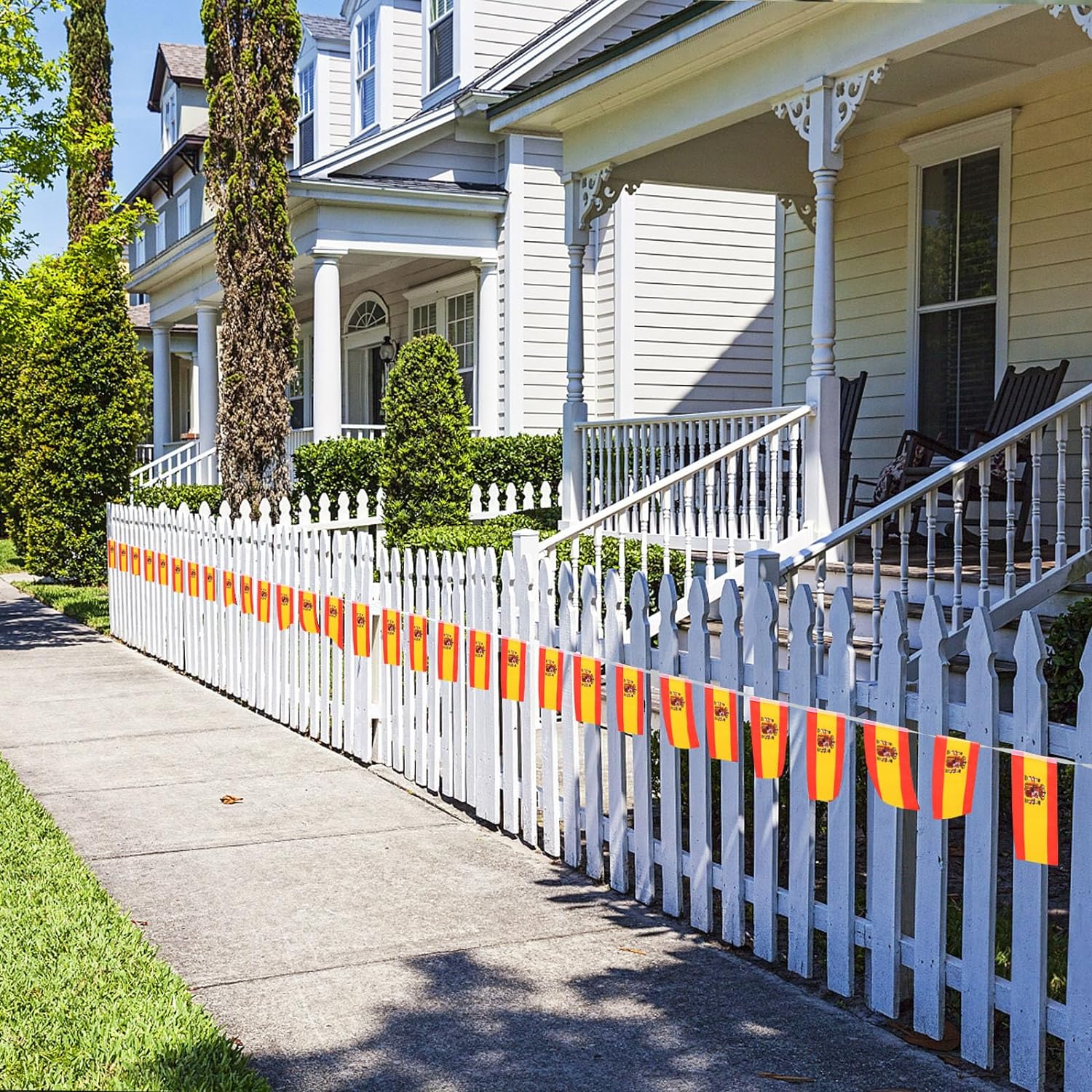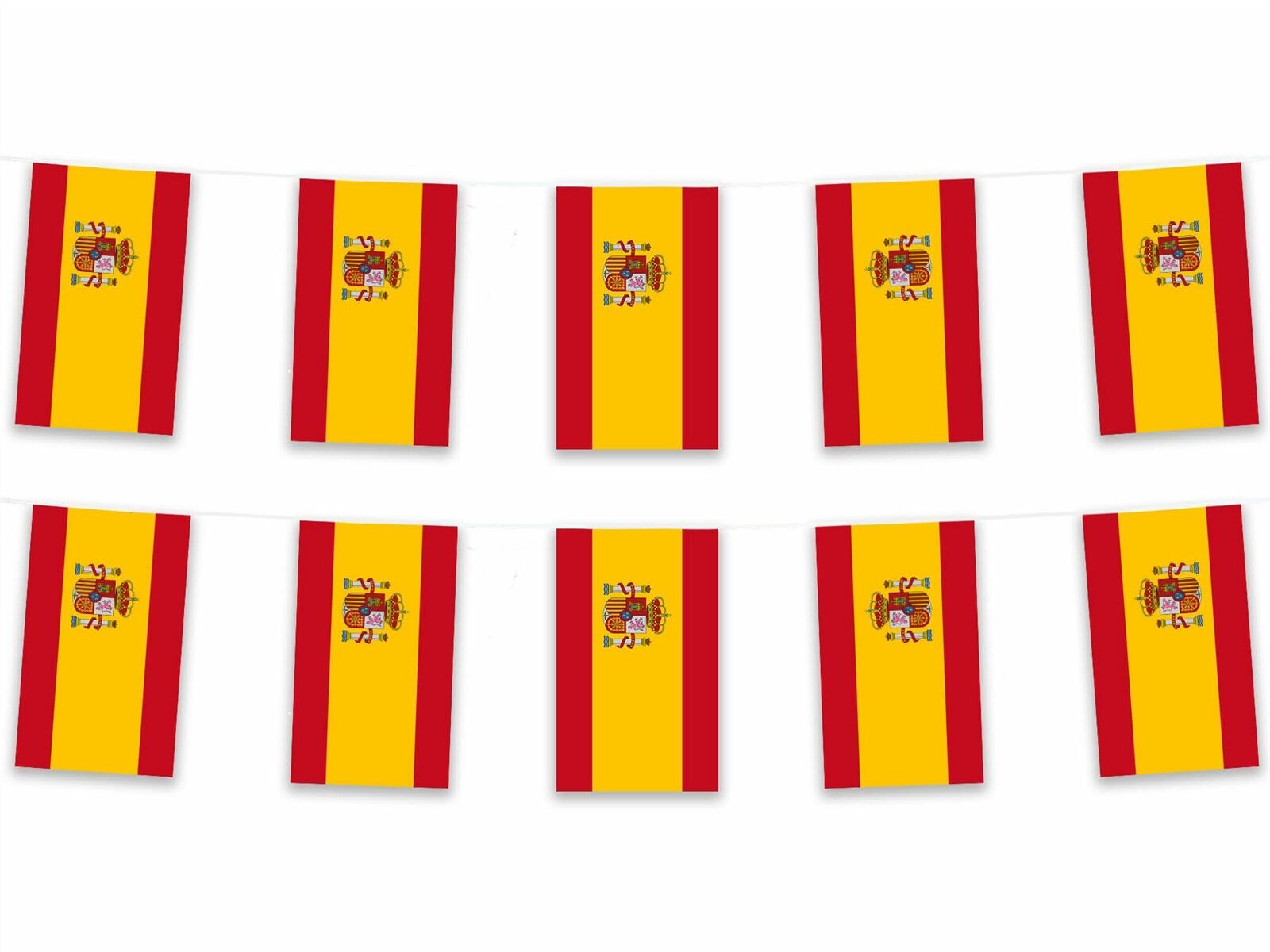 Spain Rectangle Bunting 10m with 20 Flags. This bunting measures 10m and has 20 pennants. Material: PVC. Approx size of each Flag/ Pennant 30x20cm. Introducing the vibrant and versatile Bunting 10m with 20 Pennants, a delightful addition to any celebration or decorative endeavor. This charming bunting boasts a length of 10 meters, providing ample coverage to adorn various spaces with whimsical flair. Crafted with high-quality, durable materials, each of the 20 pennants is designed to withstand outdoor elements, making it suitable for both indoor and outdoor use. Whether you're hosting a festive gathering, sprucing up a garden party, or adding a pop of color to a room, this bunting is sure to captivate attention and evoke a sense of joy and celebration. With its eye-catching design and array of vibrant colors, it effortlessly infuses any setting with a playful and festive atmosphere. Ideal for birthdays, weddings, graduations, or simply adding a touch of charm to everyday life, the Bunting 10m with 20 Pennants offers endless possibilities for creative expression. Hang it along fences, walls, ceilings, or across outdoor spaces to instantly transform any environment into a visually stunning spectacle.
