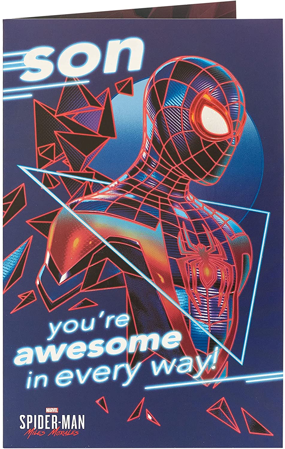 Send birthday wishes to a son who’s awesome in every way with this cool Spider-Man card, finished with a metallic foil effect. Inside Message Reads: Happy Birthday. Card Size: 149mm x 229mm. Envelope Included.