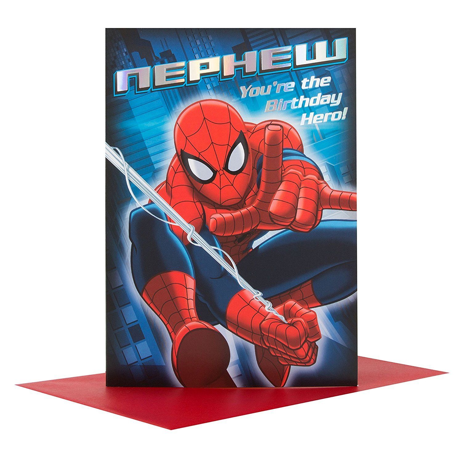 Wish a special Nephew an amazing Birthday with this Spiderman card from Hallmark. Finishes: Foil. Includes: Red Envelope. Size: 200 x 142 mm.