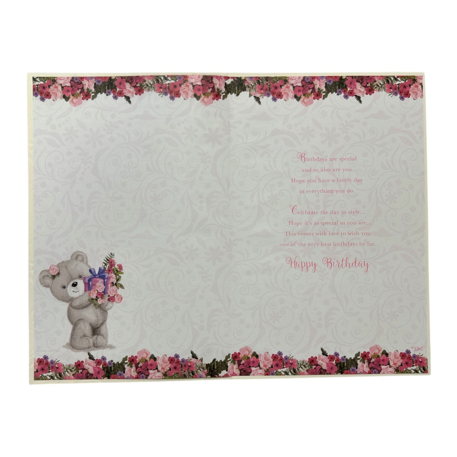 Celebrate a milestone with this beautifully designed 21st birthday card, featuring a charming teddy bear holding a delicate bouquet of pink roses and a small gift box. The bear’s gentle expression, combined with intricate three-dimensional shading making this card a heartfelt keepsake for the special day. Measuring 18 x 27 cm, this card from Xpress Yourself is printed on quality cardstock with foil and glitter accents for an extra special birthday greeting. Elegant floral embellishments and a decorative border frame the thoughtful message "On Your 21st Birthday, Best Wishes," adding a touch of sophistication. A soft pink bow ribbon is carefully attached, enhancing the card’s graceful and celebratory design. Inside the card, additional personalized text reads "Happy Birthday!" providing the perfect sentiment to go along with the fun exterior design. This ready-made 21st birthday card can be easily signed and sent without any other accessories needed to wish him a happy birthday from afar.