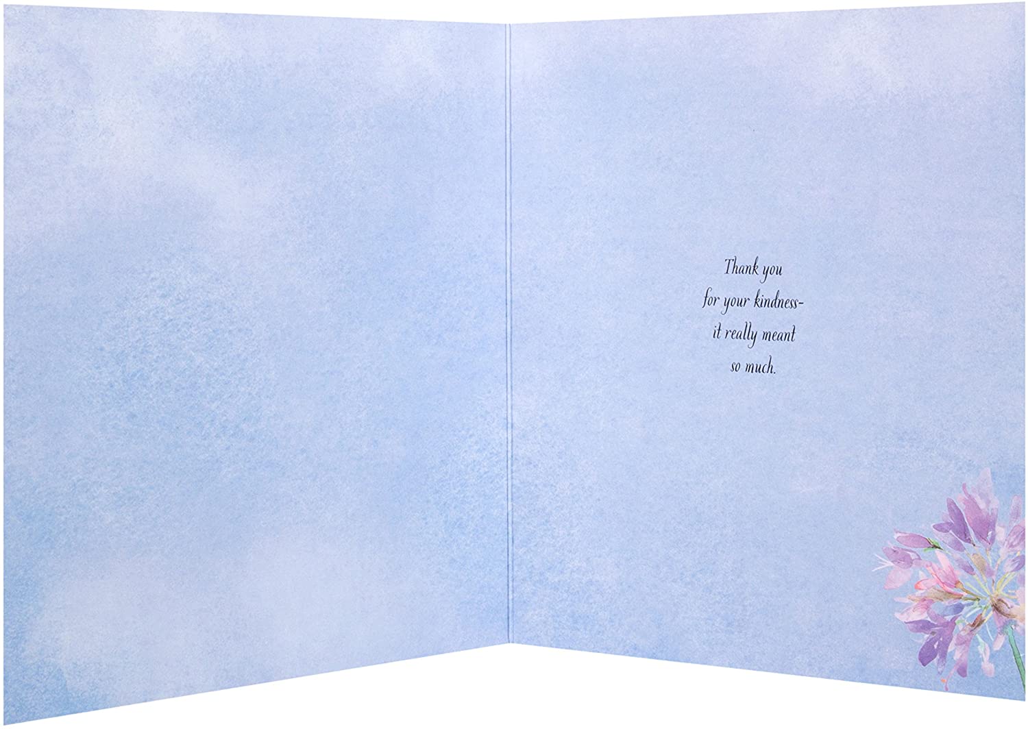 Foil Finished Flowers Design Thank You Card. Message inside card reads: 'Thank you for your Kindness - it really meant so much.'. Finish: Foil. Size: 185 x 165mm. Envelope: Purple Striped. Say thanks with this traditional card.