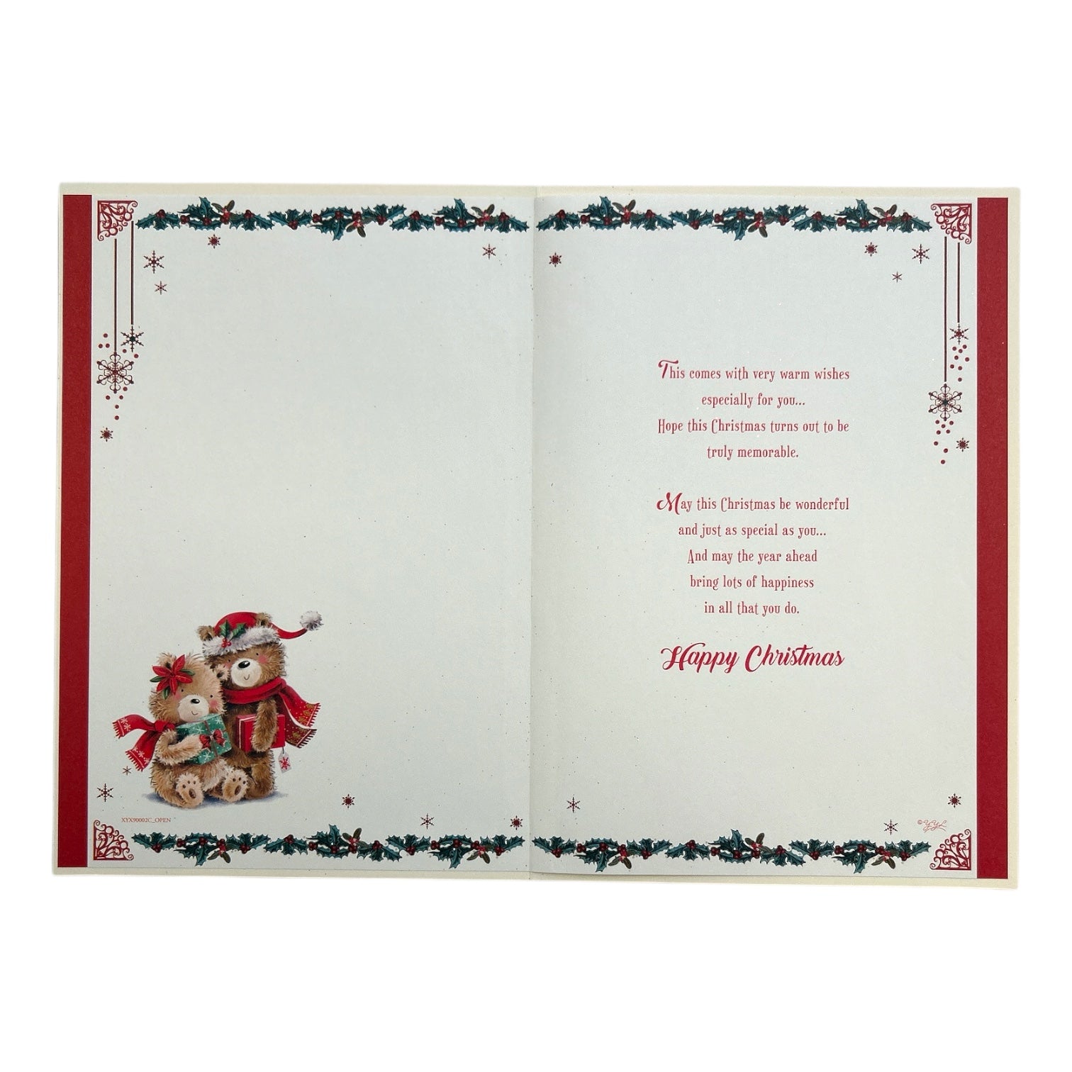 Send festive cheer to a special couple with this adorable Christmas card featuring two teddy bears dressed in holiday attire and holding gifts. Set against a rich red background with a glittering texture, the design sparkles with seasonal festivity while bright, warm lighting highlights the bears and their charming details. The cozy colors and glitter accents create a joyful atmosphere of love, sharing, and holiday celebration. Perfect for expressing warm wishes to a special couple, this delightful card captures the true spirit of Christmas. Approx. size 225 x 155mm, the card comes with a coordinating envelope.