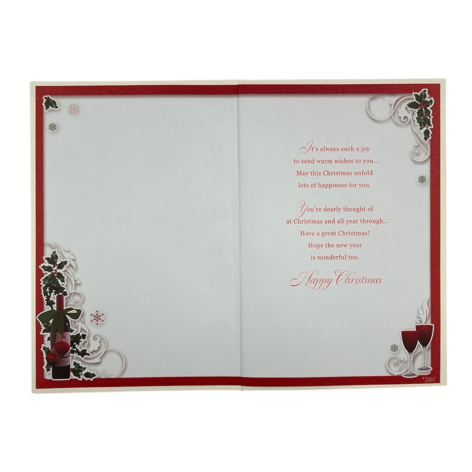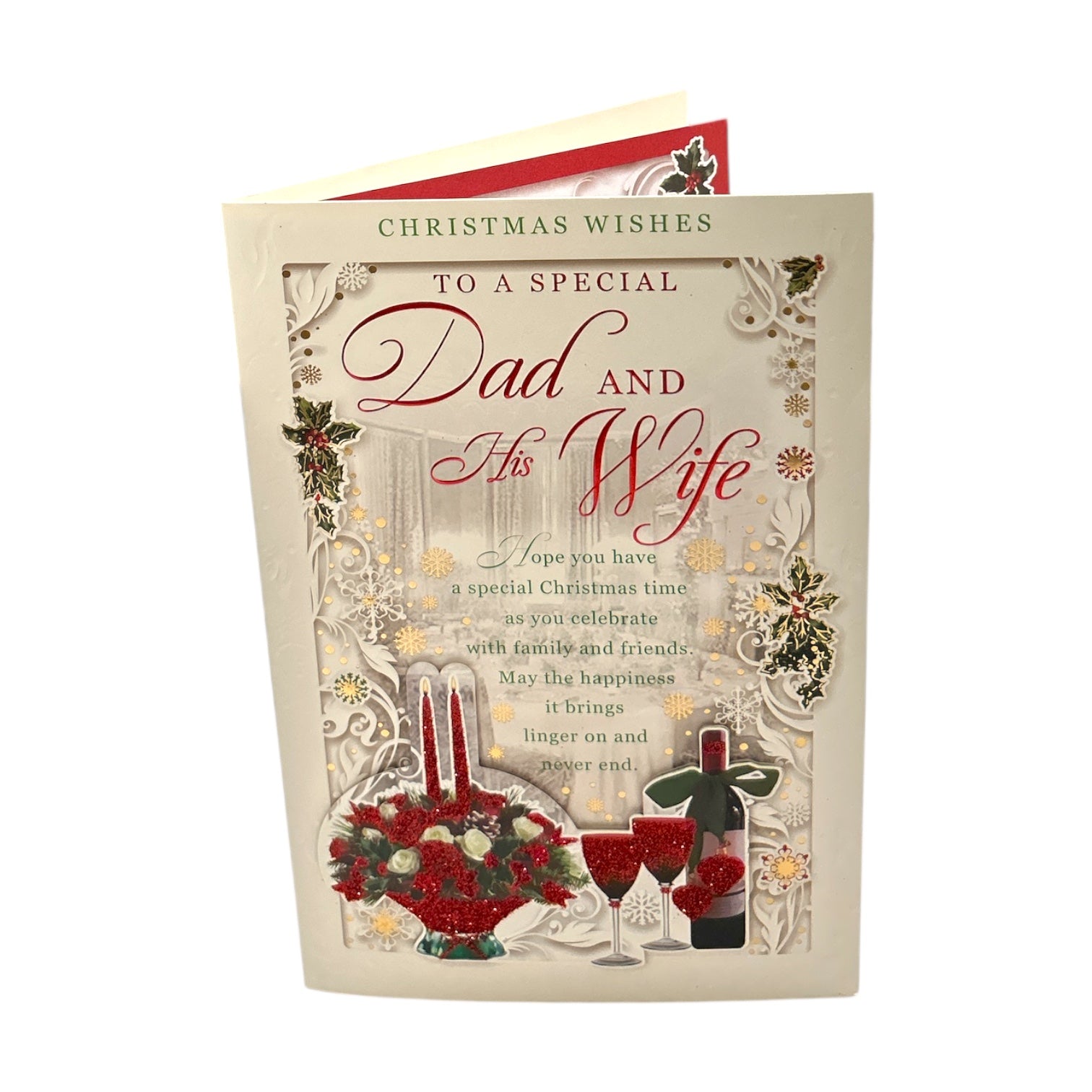 To a Special Dad and His Wife Christmas Card. A festive Christmas card featuring an elegant seasonal design with ornaments, snowflakes, candles, and a floral arrangement, set against a crisp white background. The central composition includes glowing candles, wine glasses, and a beautifully wrapped gift, symbolising warmth and celebration. Decorative snowflakes and floral patterns add a touch of winter wonderland charm, while the heartfelt message “Christmas Wishes to a Special Dad and His Wife” makes it perfect for sharing love and festive cheer. Approx. size 225 x 155mm, supplied with a coordinating envelope.