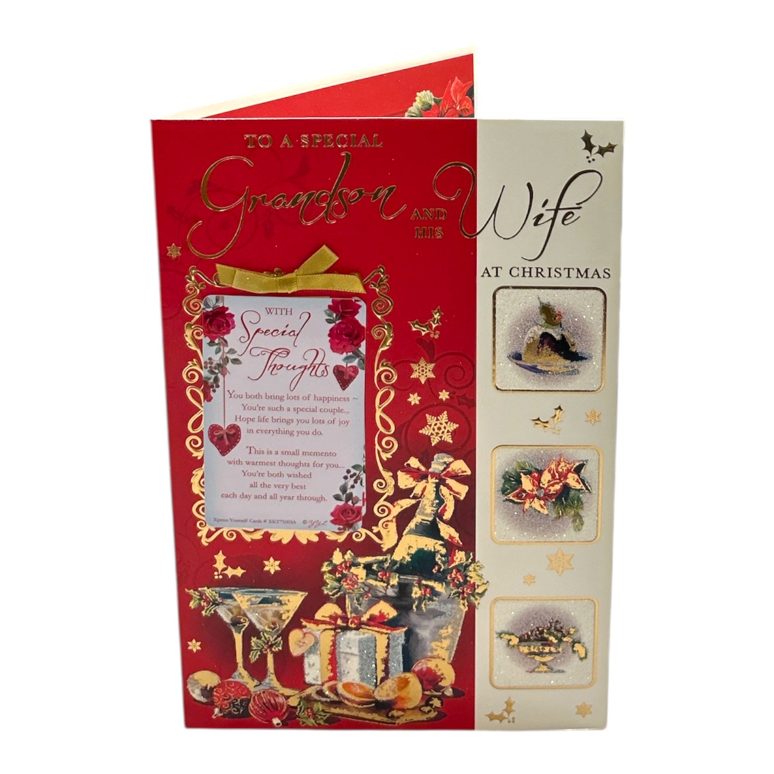Celebrate the joy of the season with this luxurious Christmas card designed especially for a beloved grandson and his wife. The rich red background is adorned with golden stars, festive holly, and elegant illustrations of champagne, cocktails, mince pies, and a beautifully decorated cake—perfectly capturing the spirit of celebration. A heartfelt Christmas verse is framed with roses and ribbon, adding warmth and sincerity. Complemented by a white panel with charming holiday images, this card blends traditional elegance with festive cheer—a perfect way to send love and festive wishes to a cherished couple.