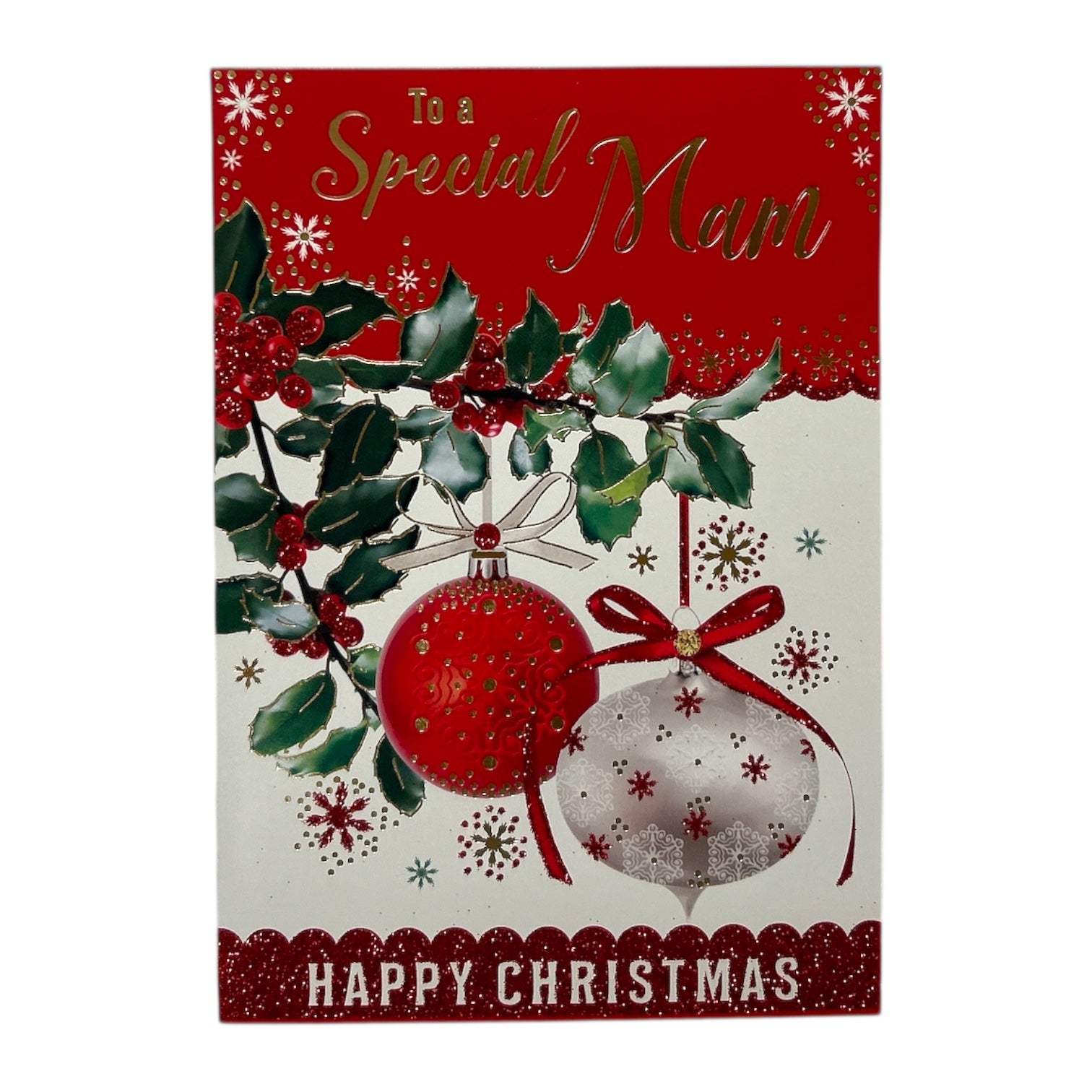 A festive Christmas card for a special Mam, featuring elegant holly branches, red berries, and beautifully decorated ornaments. The design includes a red banner at the top with golden lettering reading "To a Special Mam," and a matching banner at the bottom with the words "Happy Christmas" in white. The ornaments, one red with a textured finish and the other silver with a delicate snowflake design, are adorned with ribbons for an extra festive touch. Approx. size 225 x 155mm, supplied with a coordinating envelope.