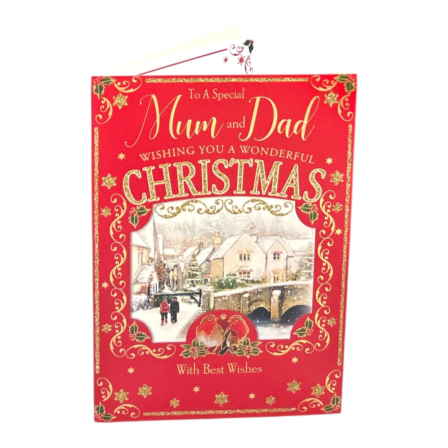 This festive Christmas card for Mum and Dad features a rich red background with elegant gold lettering, framing a peaceful snowy village scene. Two charming robins sit at the bottom of the design, symbolizing warmth and togetherness during the holiday season. The ornate border and traditional Christmas imagery create a classic, heartfelt design, evoking the beauty and spirit of a winter’s day. Approx. size 225 x 155mm, supplied with a coordinating envelope.
