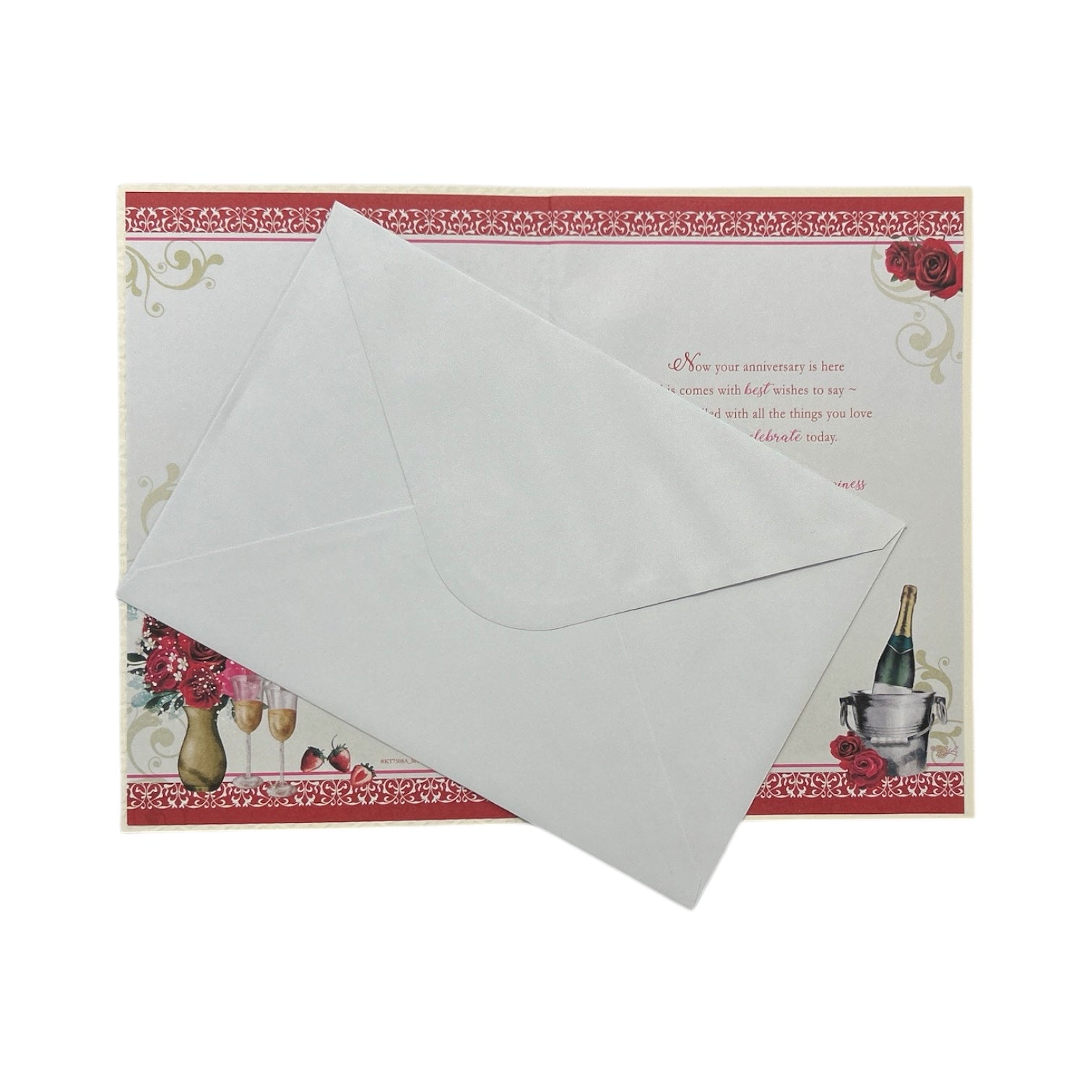 This large anniversary card features a stylish, modern design with intricate floral patterns, roses flower, champagne bottle & glasses with balloons perfect for celebrating a special day. Keepsake treasures greeting card stunning design with luxury finishes with detachable plastic keepsake attachment. The card conveys warm wishes and thoughtful sentiments, expressing love and congratulations on anniversary. Measuring 19 x 13.3 cm, this high-quality card is made from sturdy materials, ensuring a lasting keepsake. This card is a thoughtful way to commemorate anniversary and express your affection. Suitable for various occasions, this card can be given as a standalone gift or paired with other presents to make the celebration even more memorable.