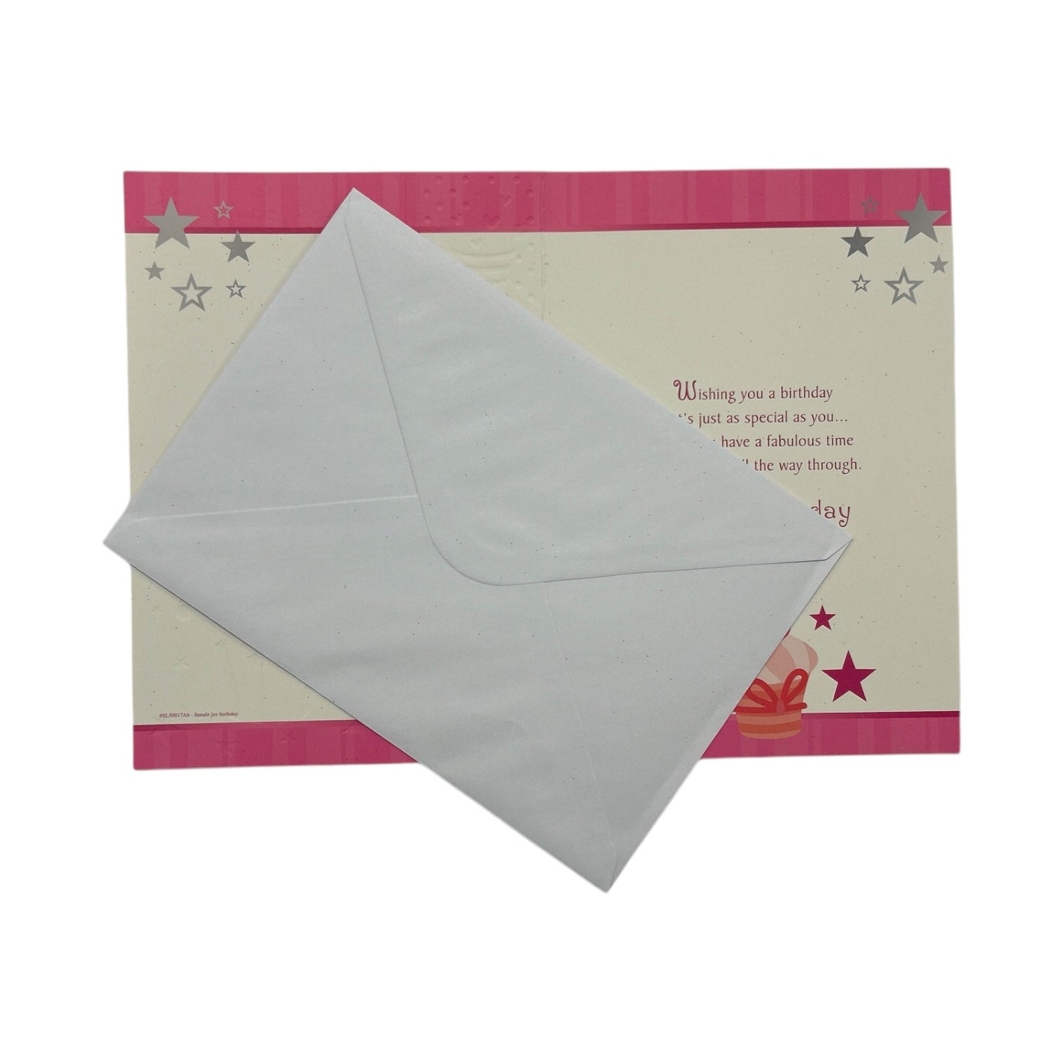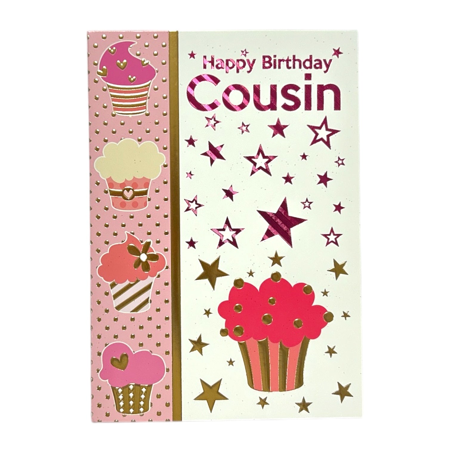This Cousin Birthday Card showcases a delightful pink and gold design, featuring a charming combination of cupcakes, stars, and elegant typography. The composition is beautifully symmetrical, with a vertical gold stripe that divides the design into two sections—one side displaying a repeating pattern of cupcakes on a soft pink background, while the other features a cream-colored backdrop adorned with scattered pink and gold stars. The words "Happy Birthday Cousin" are prominently placed in a stylized pink and gold font, adding a touch of sophistication and warmth. Inside, you'll find heartfelt birthday wishes, making this card a perfect way to celebrate a beloved cousin's special day. The card comes with a coordinating envelope. Card size: Approx. 19.5 x 14 cm.