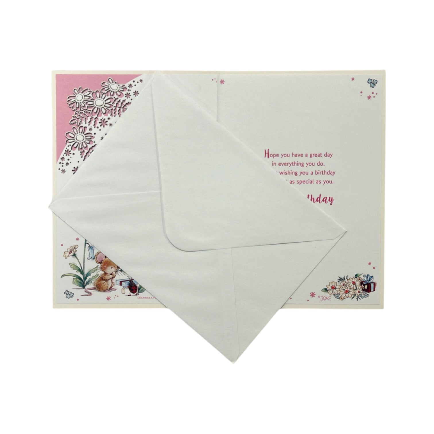 Celebrate your Aunt’s special day with this charming and thoughtful Birthday Card. The front features an adorable mouse holding flowers, standing next to a beautiful flower plant, capturing the essence of nature and love. The card is beautifully embossed with delicate floral motifs, and the foil details add a touch of shimmer and elegance. Inside, you’ll find a heartfelt Birthday Wishes message, expressing your love and appreciation for your aunt. This card is the perfect way to show your aunt how much she means to you on her birthday. The card comes with a coordinating envelope. Card Size: Approx. 19.5 x 14 cm.