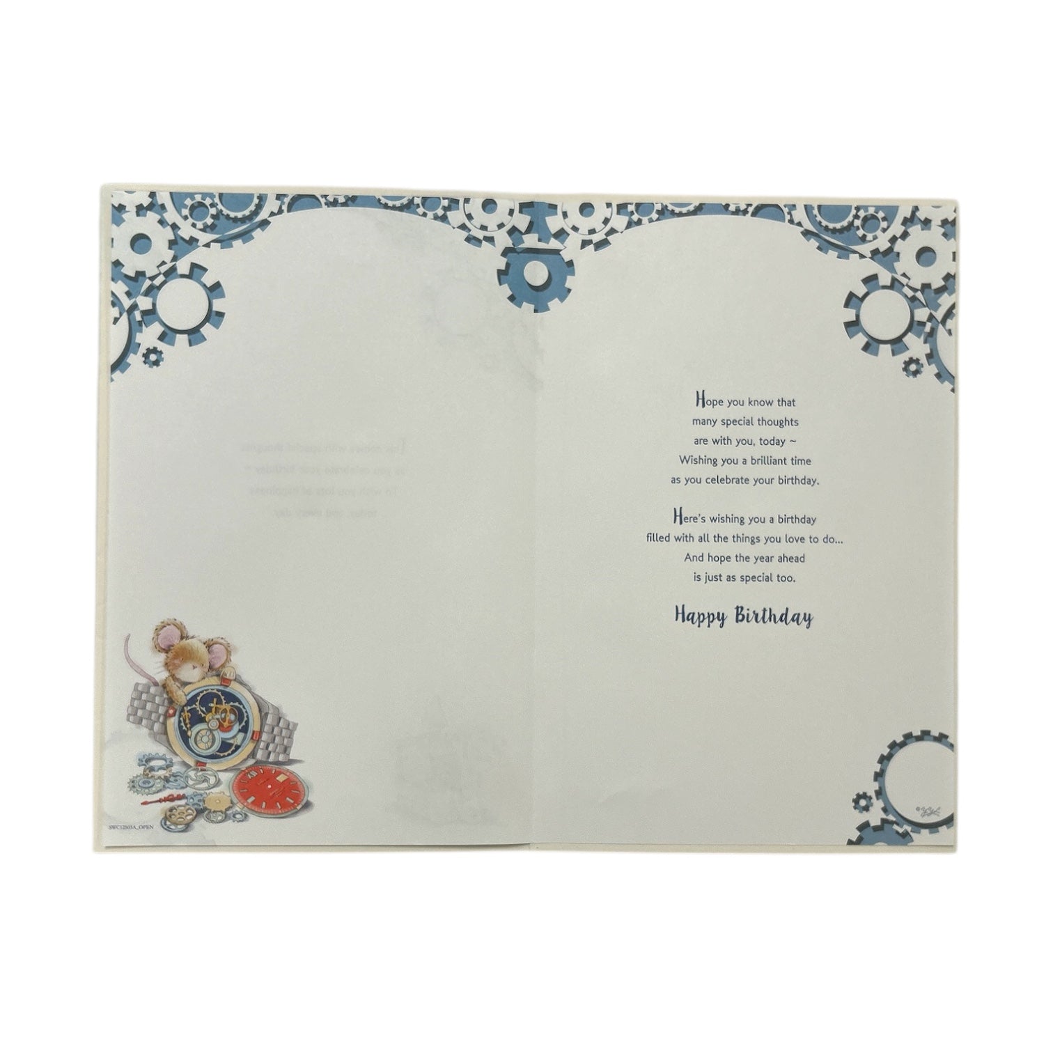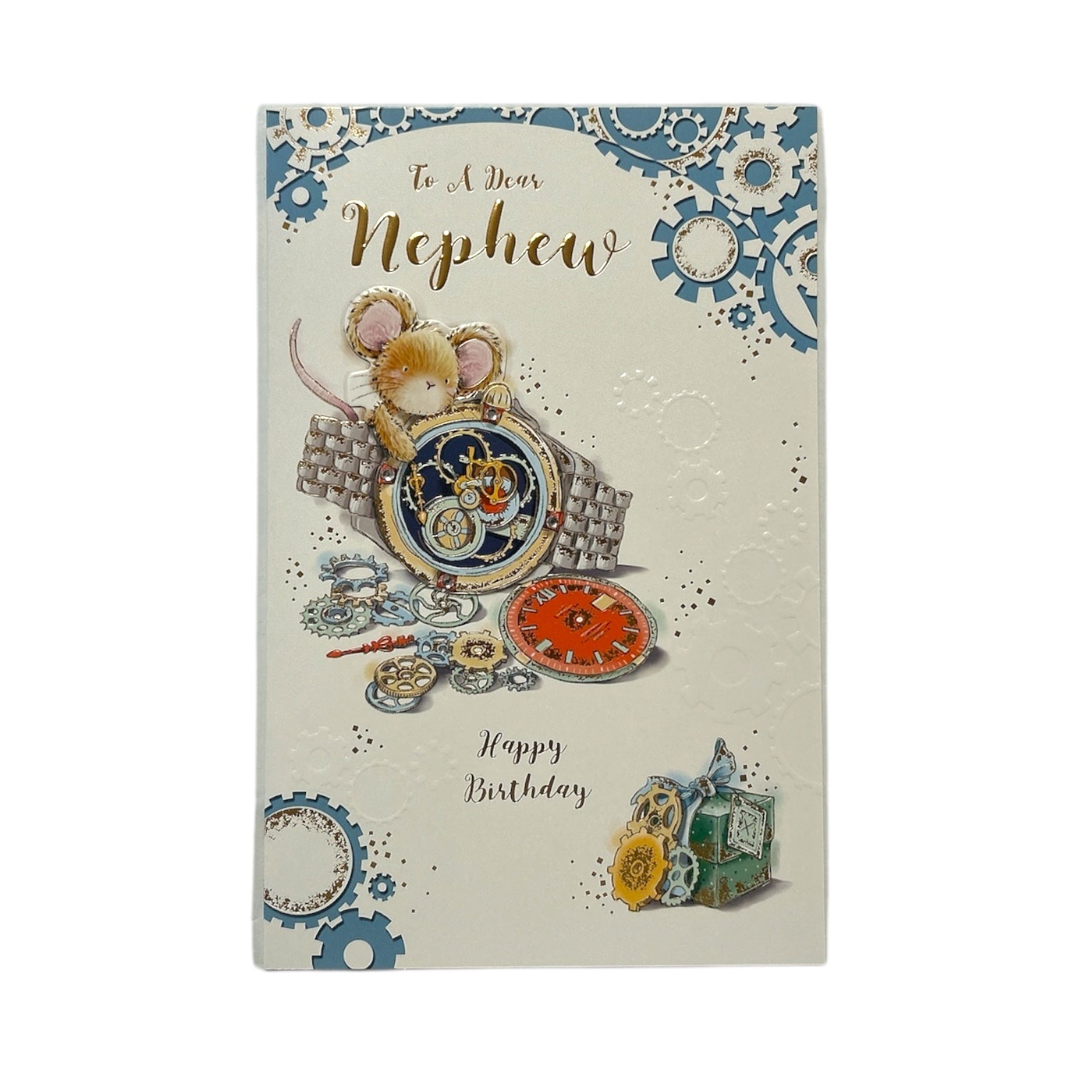 Make your nephew’s birthday extra special with this Cute & Lovely Birthday Card. Featuring an adorable mouse alongside a watch and intricate watch parts accessories, this charming design is both unique and delightful. Elegant embossed details and shimmering foil accents add a touch of sophistication, making it a memorable keepsake. With a heartfelt Birthday Wishes message inside, this card is the perfect way to celebrate his special day. The card comes with a coordinating envelope. Card Size: Approx. 19.5 x 14 cm.