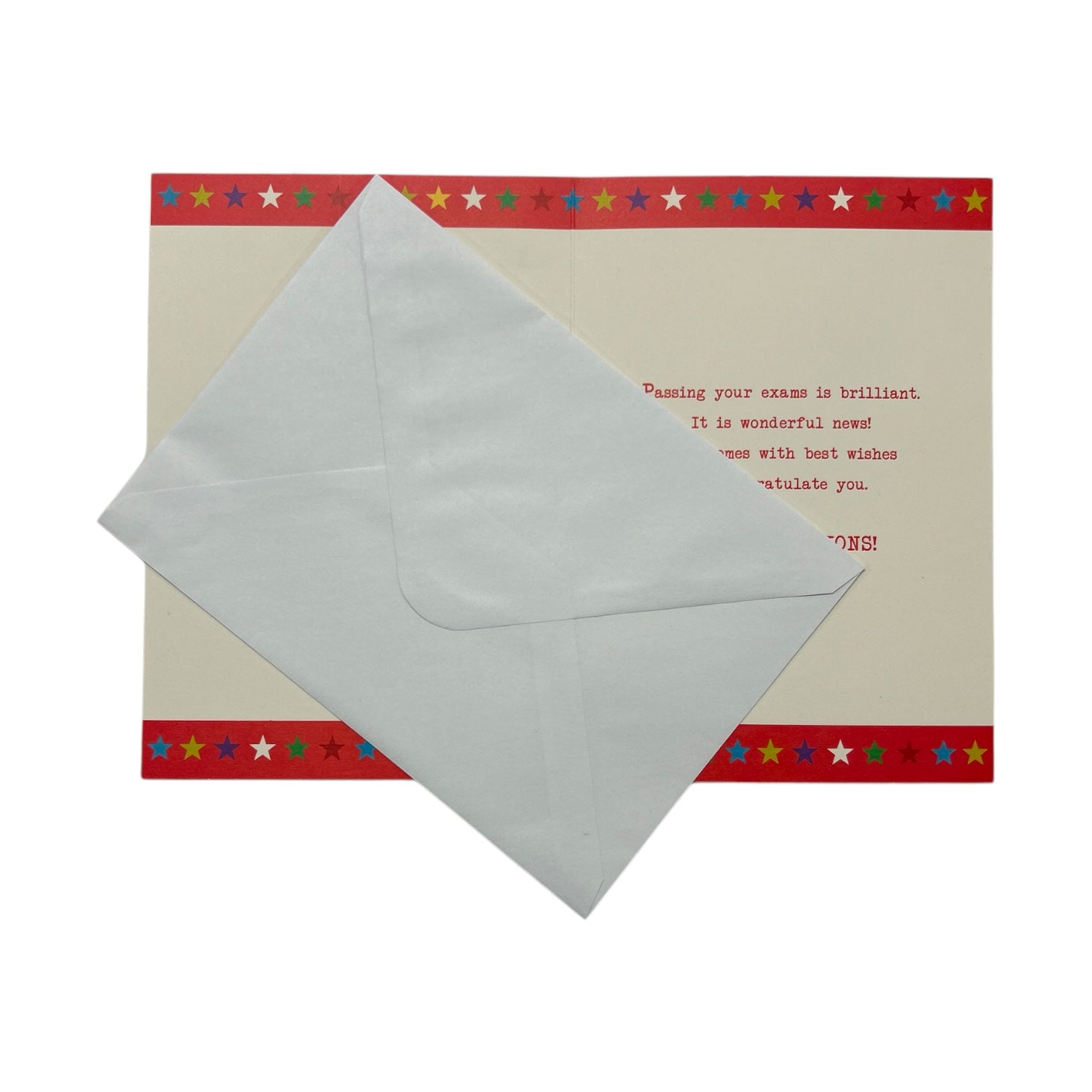 This is a vibrant and celebratory card with a red background. The design includes colorful stars scattered across the card, along with a large blue and yellow striped pencil illustration. A decorative multicolored star border frames the edges, adding to the festive and cheerful feel. This card is perfect for congratulating on their achievement with warm wishes. The elegant design is enhanced with embossed details foil accents. Complete with a coordinating envelope. Card size: Approx. 19.5 x 14 cm.