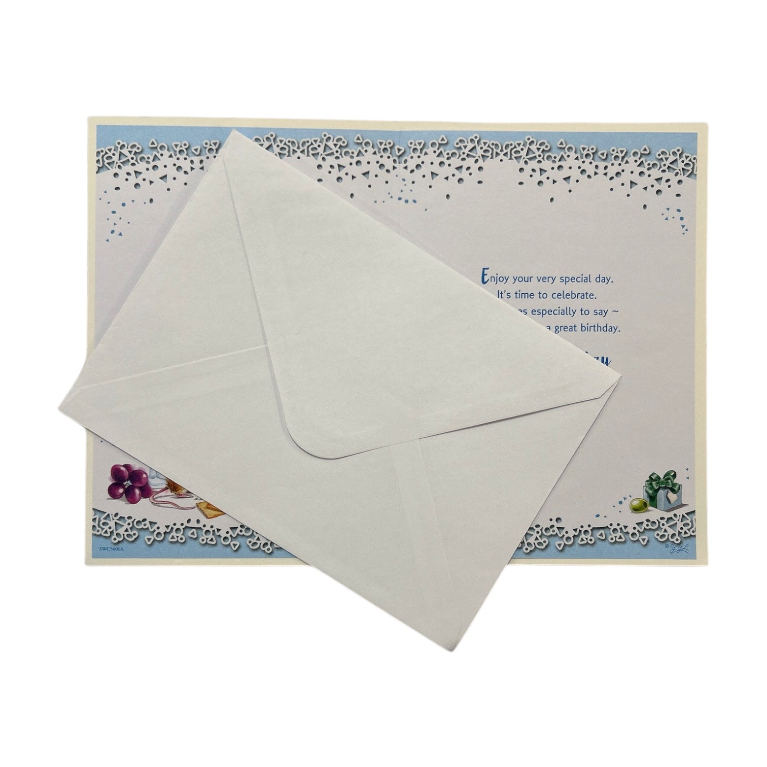 Celebrate your Son’s special day with this delightful and playful Birthday Card. The front features a cute mouse happily enjoying a piece of cheese, sitting next to a wine glass and grapes, creating a whimsical and charming scene. The card is beautifully embossed, with intricate details and shimmering foil accents that add a touch of elegance. Inside, you'll find warm Birthday Wishes expressing your love and appreciation for him. This card is the perfect way to make your son’s birthday even more special. The card comes with a coordinating envelope. Card Size: Approx. 19.5 x 14 cm.