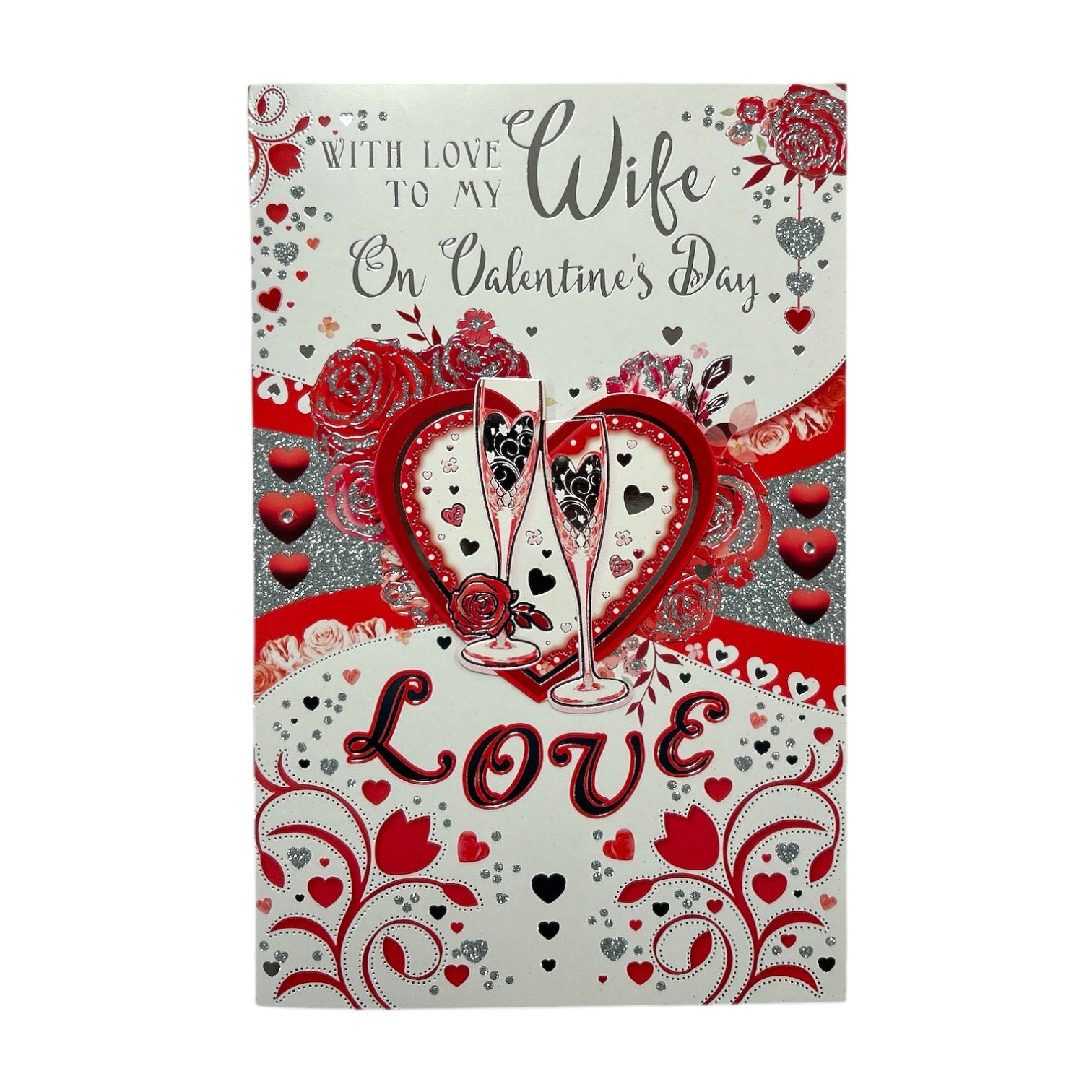 To My Wife Hearts and Champagne Glass 8 Page Insert Valentine's Day Card. Best Selling Sentimental Verses. Top Quality Card With Silver Glitter.