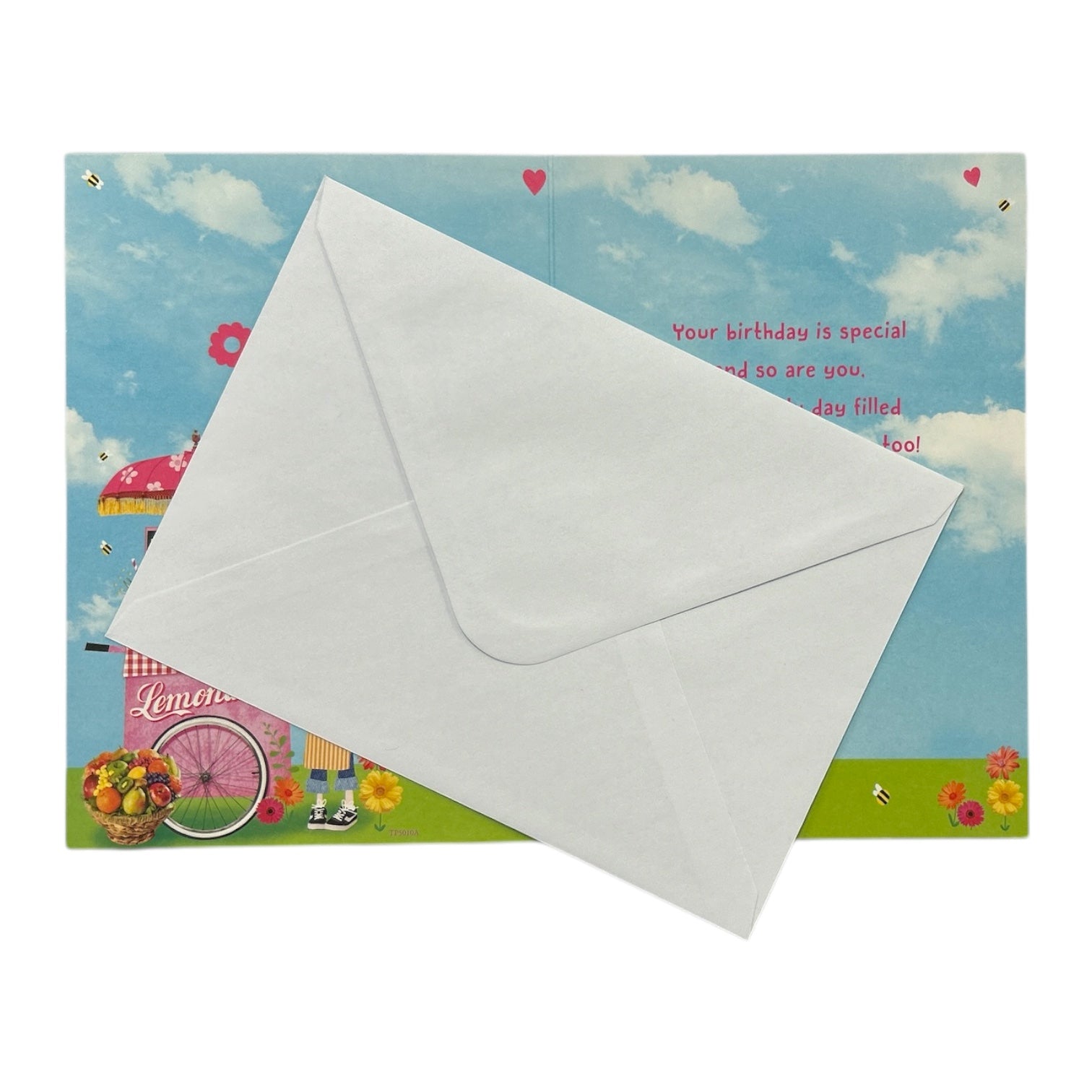 Make your niece’s birthday extra special with this cheerful and playful card! The front features a cheerful young girl selling lemonade at a charming stand, holding a refreshing glass of lemonade. The stand is beautifully decorated with colorful fruits, with a vibrant umbrella shading the setup and a fun "Fresh Juice" sign displayed above. The background showcases a bright blue sky with fluffy white clouds, creating a joyful and cheerful scene. At the top, the words "NIECE Have FUN!" are prominently displayed in a multicolored, slightly embossed font, making the design even more festive. Inside, the card contains a lovely birthday verse, perfect for sending warm and heartfelt wishes. The card comes with a coordinating envelope. Card size approx. : 19 x 13cm.