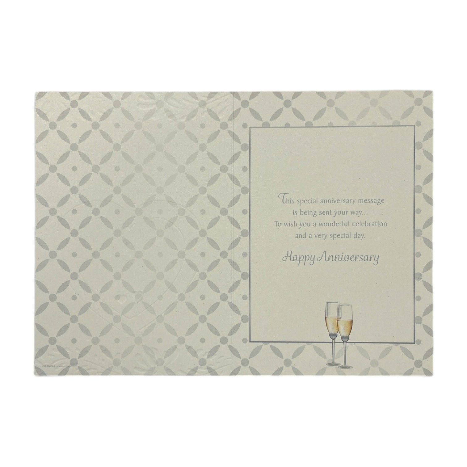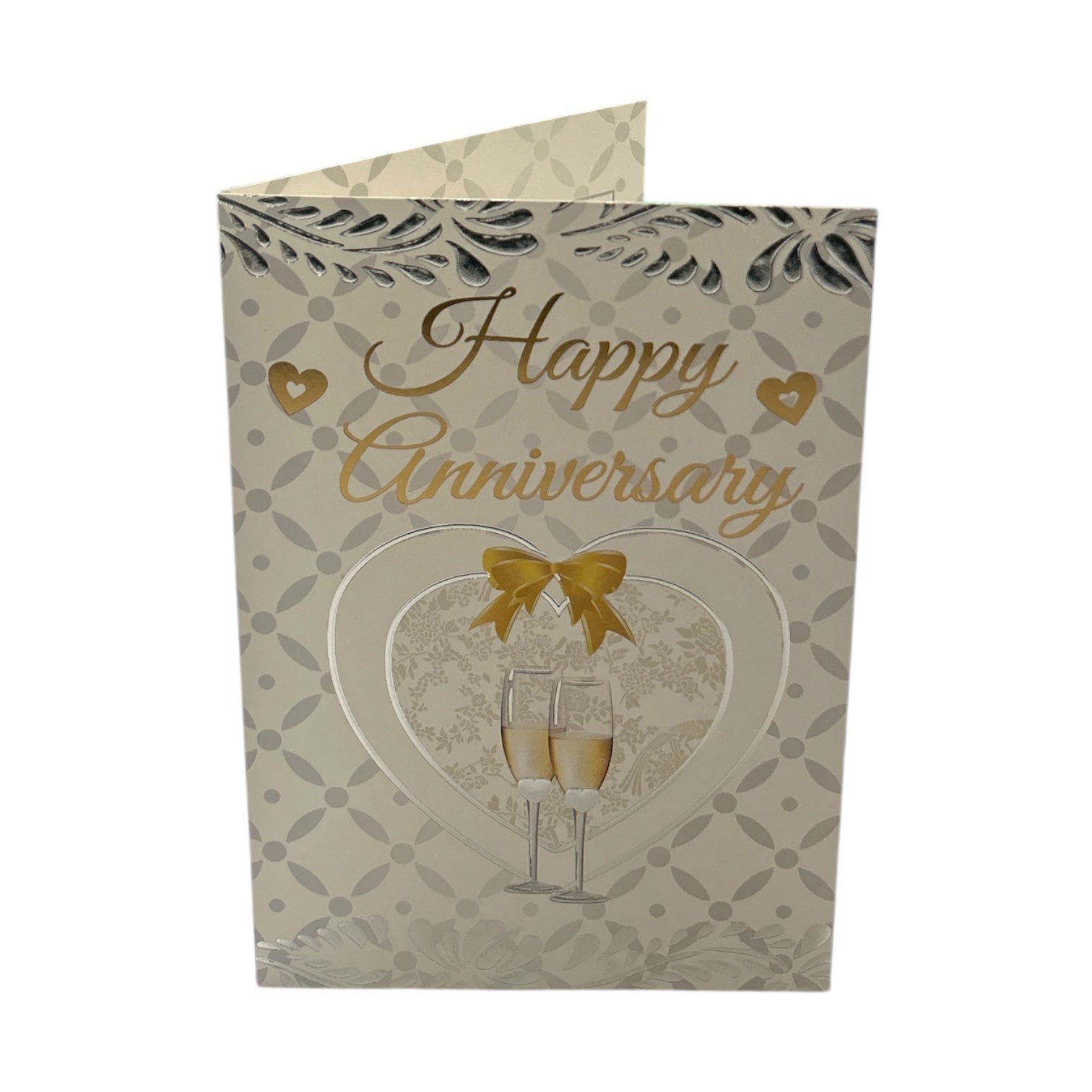 The card features a soft cream-colored background with a subtle diamond pattern, accented by silver and gold details. At the center, an embossed heart frames two champagne glasses tied with a gold ribbon, symbolizing celebration and love. Small gold hearts and delicate silver floral patterns add to the romantic and luxurious feel. It comes complete with a coordinating envelope. Card size: Approx. 19.5 x 14 cm.