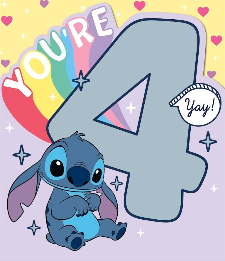 UNIQUE DISNEY STITCH 4TH DESIGN FOR GIRLS: This delicate card is made with unique cheeky Stitch Design from Lilo & Stitch, Message on the front of the card says "You're 4 Yay!" And inside of the card says "Do What Makes You Happy On Your Special Day! Happy Birthday " This card comes with coordinating envelope. SPECIAL BIRTHDAY WISHES: This unique card will let someone special, or a loved one know that they are in your thoughts and that you want to send them good wishes. Receiving a card always makes someone feel good, giving them a warm feelings to know that someone is thinking and caring about them which is one of the most joyous feelings of life. BEAUTIFUL BIRTHDAY CARD FOR HER: This illustrated birthday card is sure to make them smile. Suitable for Young Girl, Daughter, Granddaughter, Sister, Niece, Friend, or any other loved one. BRANDED PREMIUM QUALITY CARD: This card is manufactured in UK, Created with innovative and attractive designs on high quality board and finished to an excellent standard. CARD SIZE: 18.5cm x 15cm ROYAL MAIL STANDARD LETTER SIZE