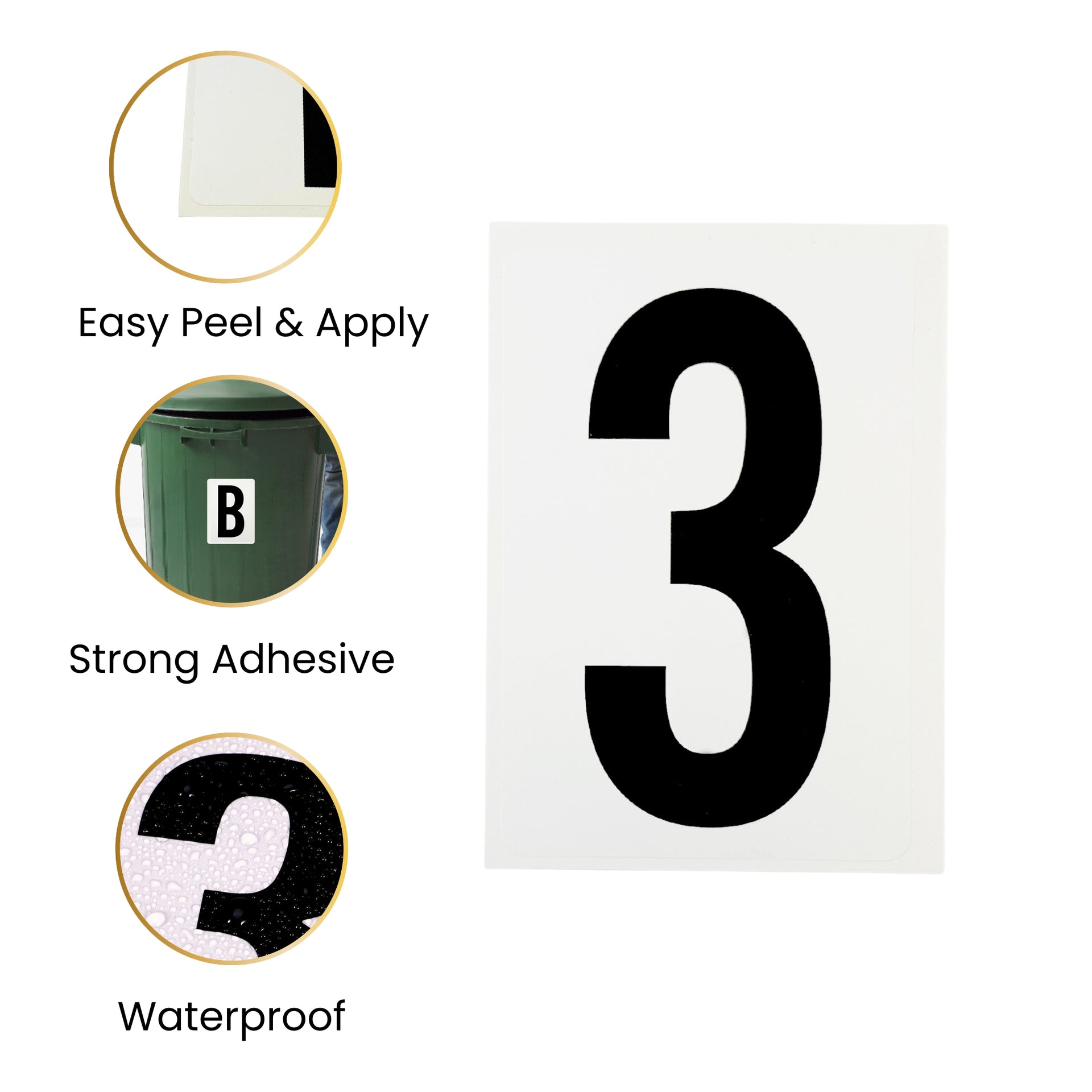 Waterproof Wheelie Bin Black Number Sticker – White Background. Easily identify your bins with these bold Black Letter and Number Stickers on a clean white background. Designed for outdoor use, each durable vinyl label is fully waterproof and weather-resistant, ensuring long-lasting visibility through rain or shine. Perfect for personalising wheelie bins, recycling boxes, or outdoor containers. Simple to apply with a strong peel-and-stick adhesive. Available in Letters A & B and Numbers 0–9.