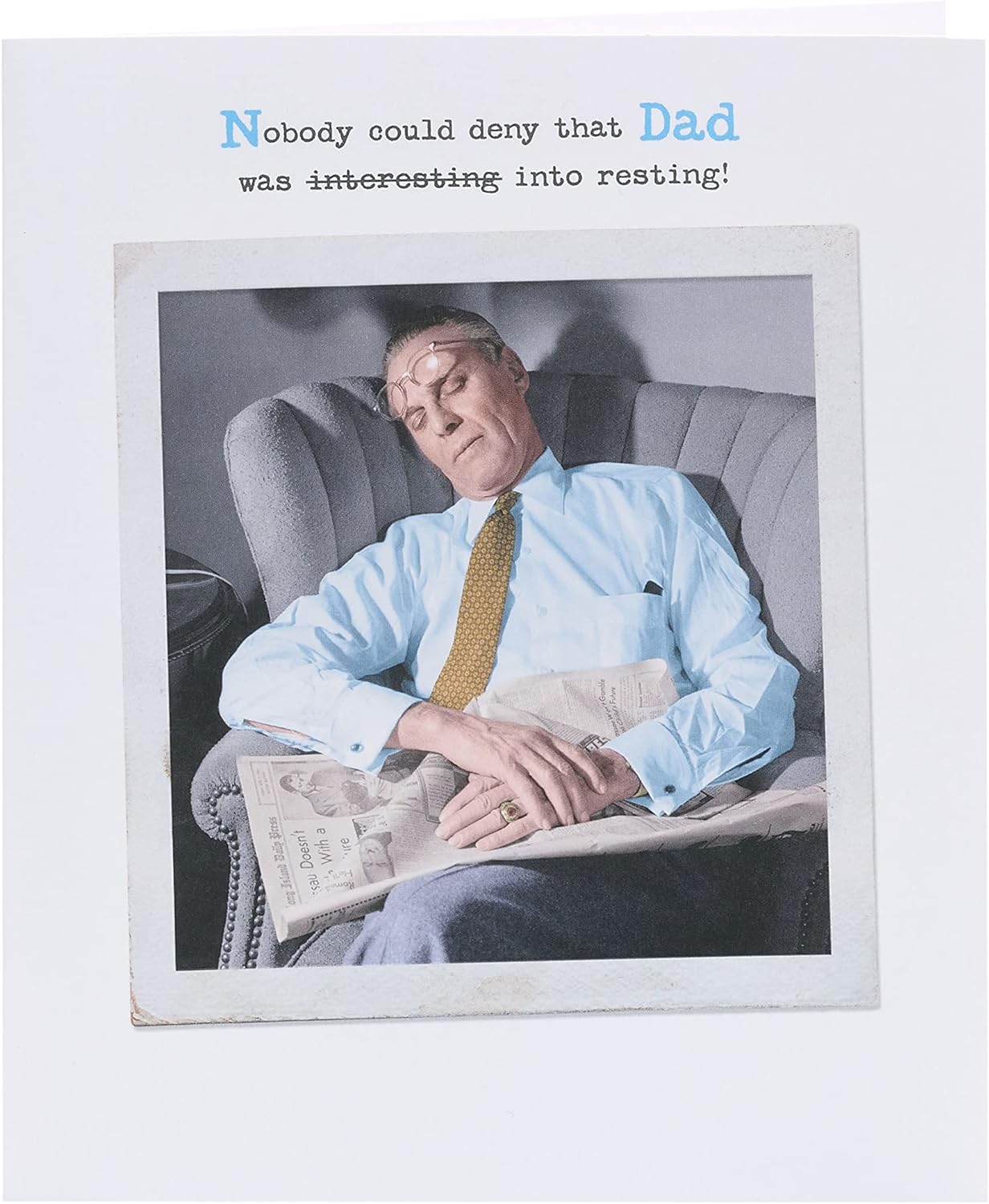 This funny Father’s Day card features a vintage photo of a man snoozing in an armchair and a joke about Dad being “into resting”. Message Inside Reads: Happy Father's Day! Card Size: 159mm x 184mm. Envelope Included. This product is FSC-labelled, meaning you’re supporting responsible forestry and helping fight climate change, protect biodiversity, and support communities.