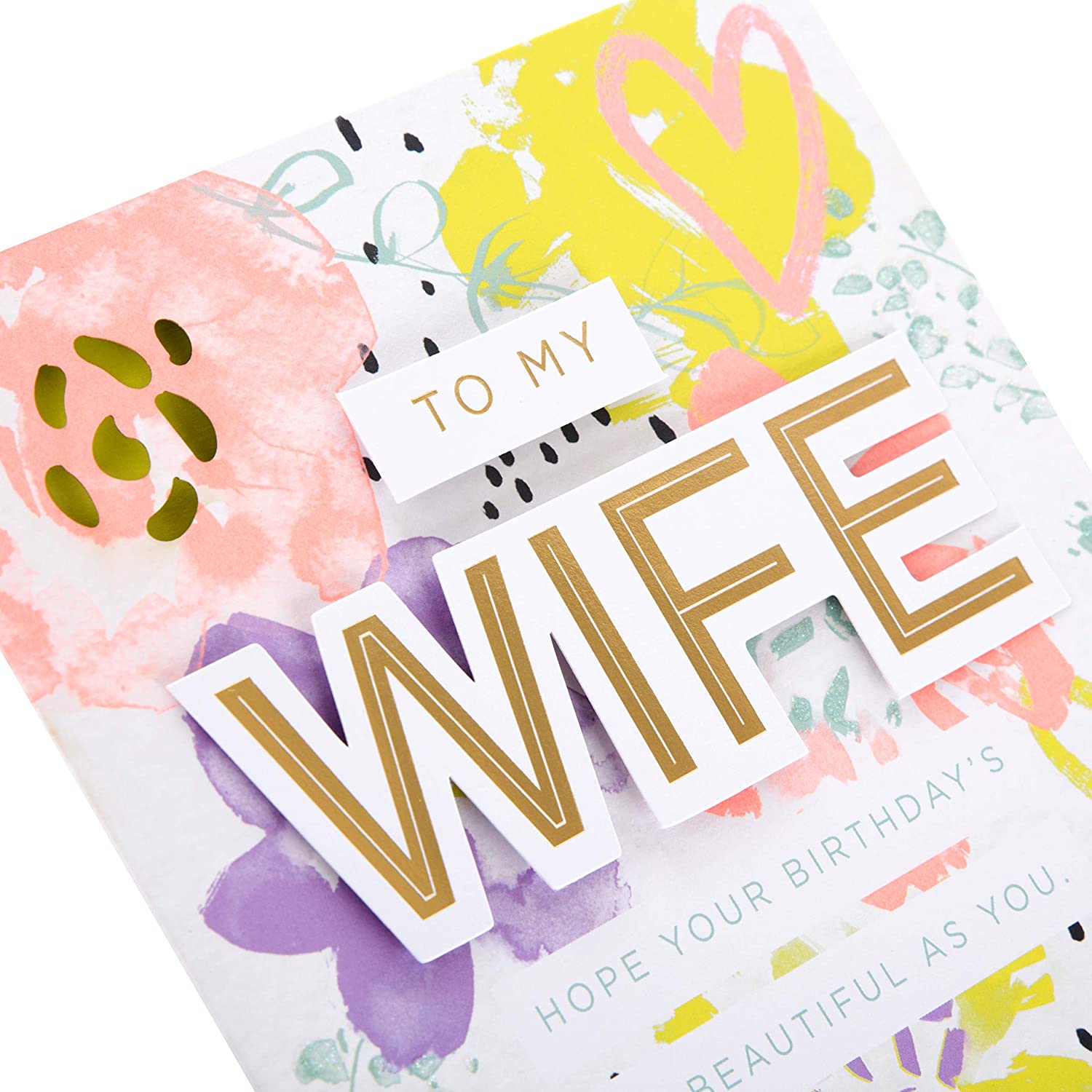 Brighten up your wife's birthday with this vibrant card from Hallmark. 3D lettering attachment. Neon inks. Gold foil lettering. Iridescent glitter highlights. Die-cut details. Co-ordinating bright green printed envelope. Message reads: front: to my Wife, Hope your birthday's as beautiful as you. Inside: Wishing you everything wonderful on your special day - because you're amazing and deserve The very best. Enjoy every moment. Measures 22.8cm by 15.9cm, within Standard UK 'Letter' Size limits.