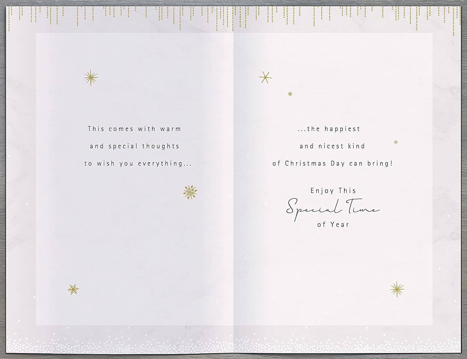 You are viewing: A greeting card. Occasion: Christmas. Message: This comes with warm and special thoughts to wish you everything... ...the happiest and nicest kind of Christmas Day can bring! Enjoy This Special Time of Year. Details: A lovely foiled Christmas greeting card with a pretty finish and a lovely verse inside, it comes complete with a quality envelope. Size: 12cm x 18cm 5" x 7"