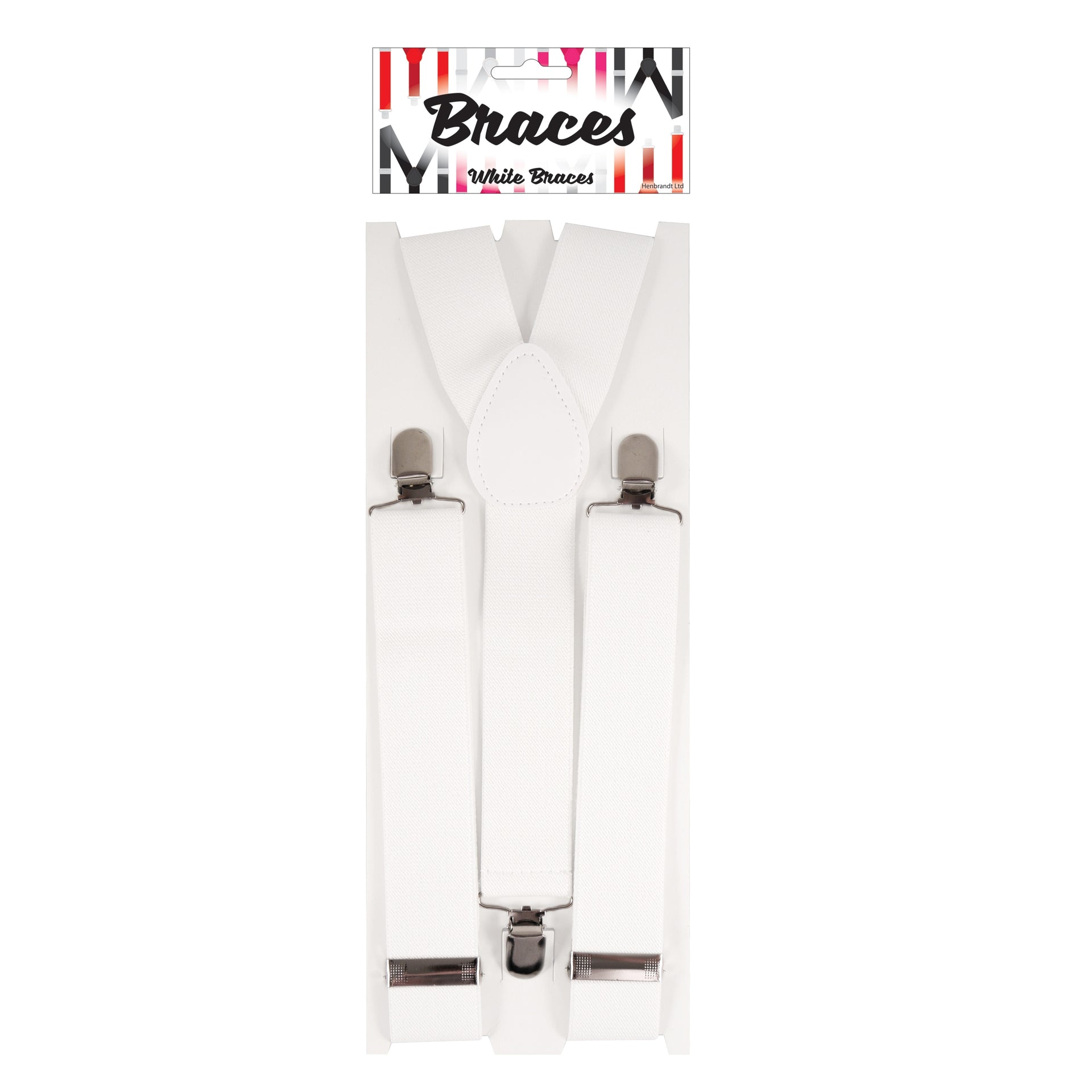 X Shape Trouser Braces White. Ideal for Daily Wear, Parties, Hen Nights or Fancy Dress etc. Fully Adjustable and Elastic. Wide with very strong metal clips.