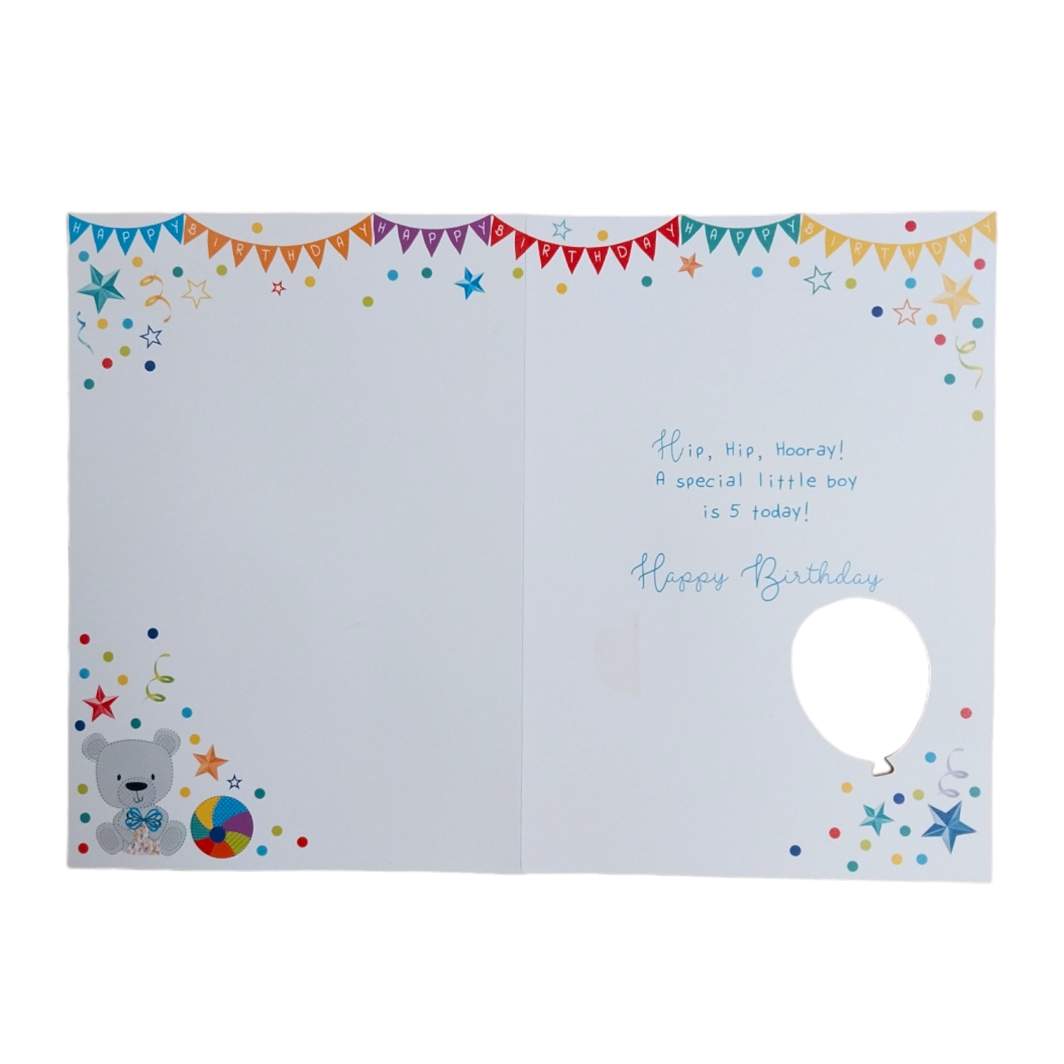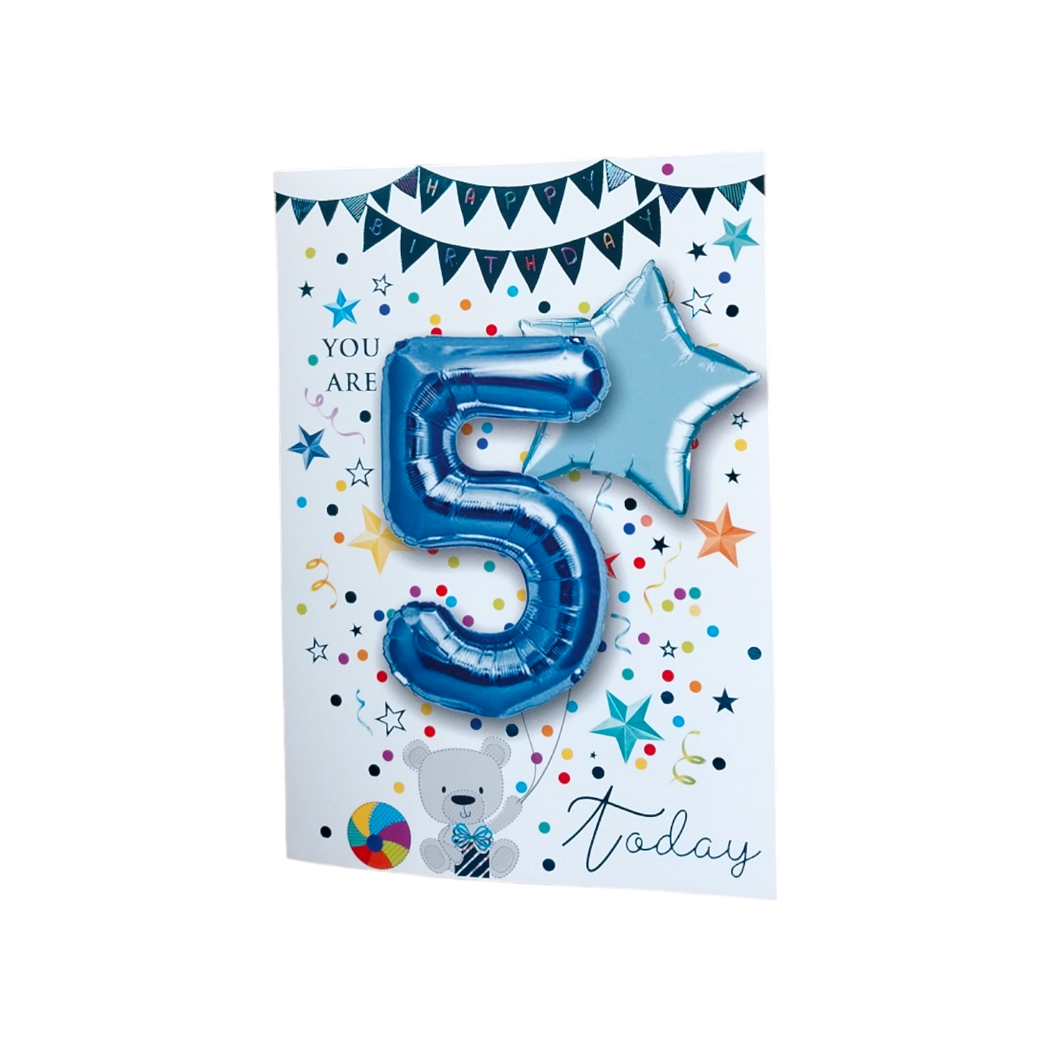 A contemporary foil finished greeting card by Balloon Boutique. Air fill only (not suitable for helium). Includes 2 Foil Balloons, straw for inflating balloons. 2m Ribbon for handing balloons. Unsuitable for helium. Size of card 190x130mm. Message inside: Hip, Hip, Hooray! A special little boy is 5 today! Happy Birthday.