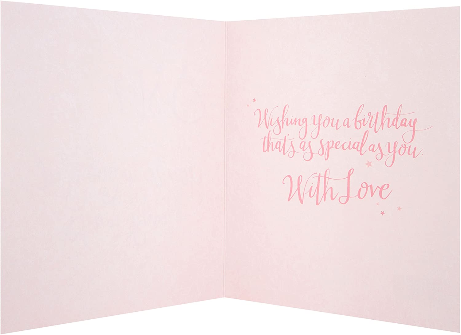 You Are Wonderful In So Many Ways Sister Birthday Card. Message inside card reads: 'Wishing you a birthday that's as special as you with love'. Finish: Foil, Diamante. Size: 160 x 180mm. Envelope: White. Send Birthday wishes to a special Sister with this contemporary card.